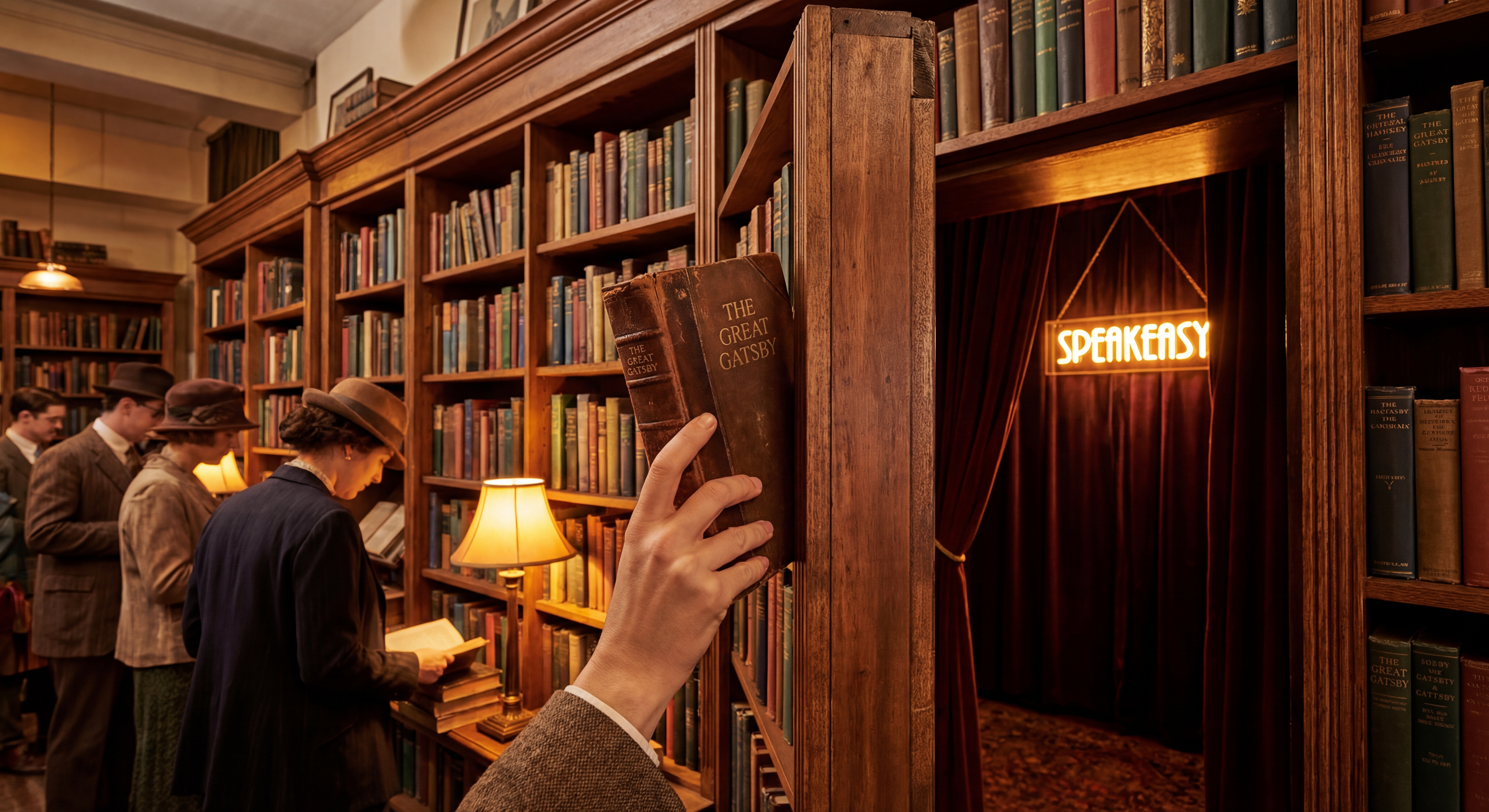 - Bức tường kệ sách: Một motif kinh điển nhưng chưa bao giờ lỗi thời. Bạn bước vào một căn phòng nhỏ trông như thư viện mini hoặc phòng chờ. Nhiệm vụ của bạn là tìm ra cuốn sách "chìa khóa". Kéo nhẹ gáy sách, bức tường xoay chuyển, và tiếng nhạc Jazz dìu dặt ùa ra đón chào.