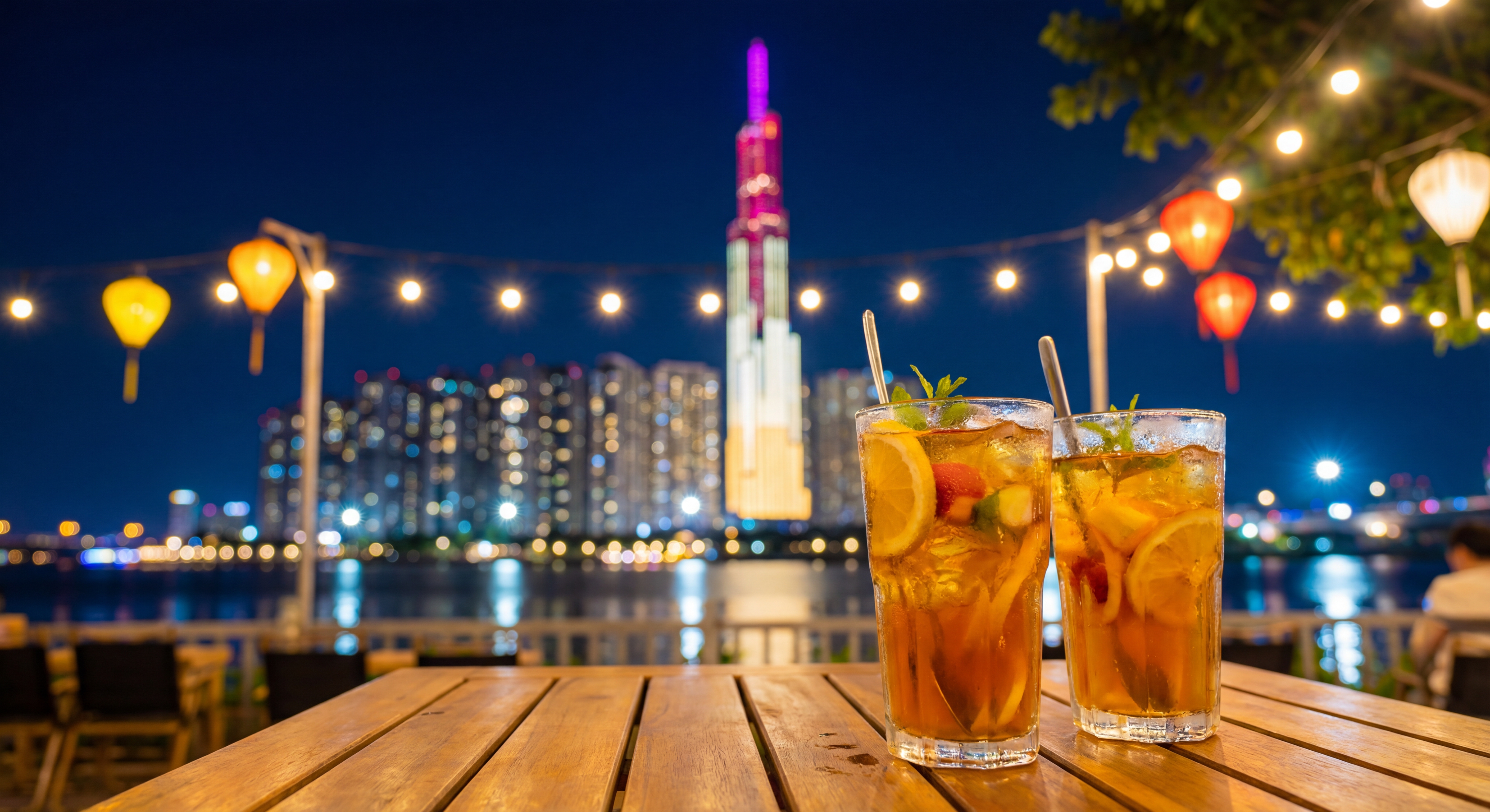 Ngồi tại đây, nhâm nhi ly nước, bạn sẽ được chiêm ngưỡng toàn cảnh trung tâm thành phố từ phía bên kia bờ sông. Khi hoàng hôn tắt hẳn, Sài Gòn bắt đầu lên đèn. Những tòa nhà cao tầng đồng loạt bật sáng, in bóng xuống mặt nước đen thẫm tạo nên một bức tranh huyền ảo, lung linh đến nghẹt thở.